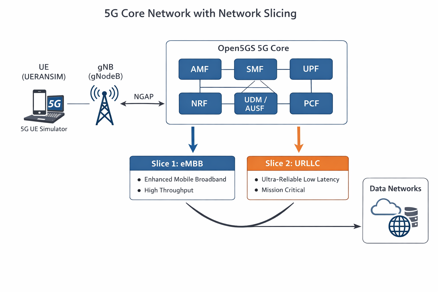 Designed and deployed Open5GS 5G Core on AWS EC2 with full end-to-end connectivity using UERANSIM, Implemented multi-slice (S-NSSAI), Validated "NGAP, PFCP, GTP-U signaling, and GTP tunnel (uesimtun0)"